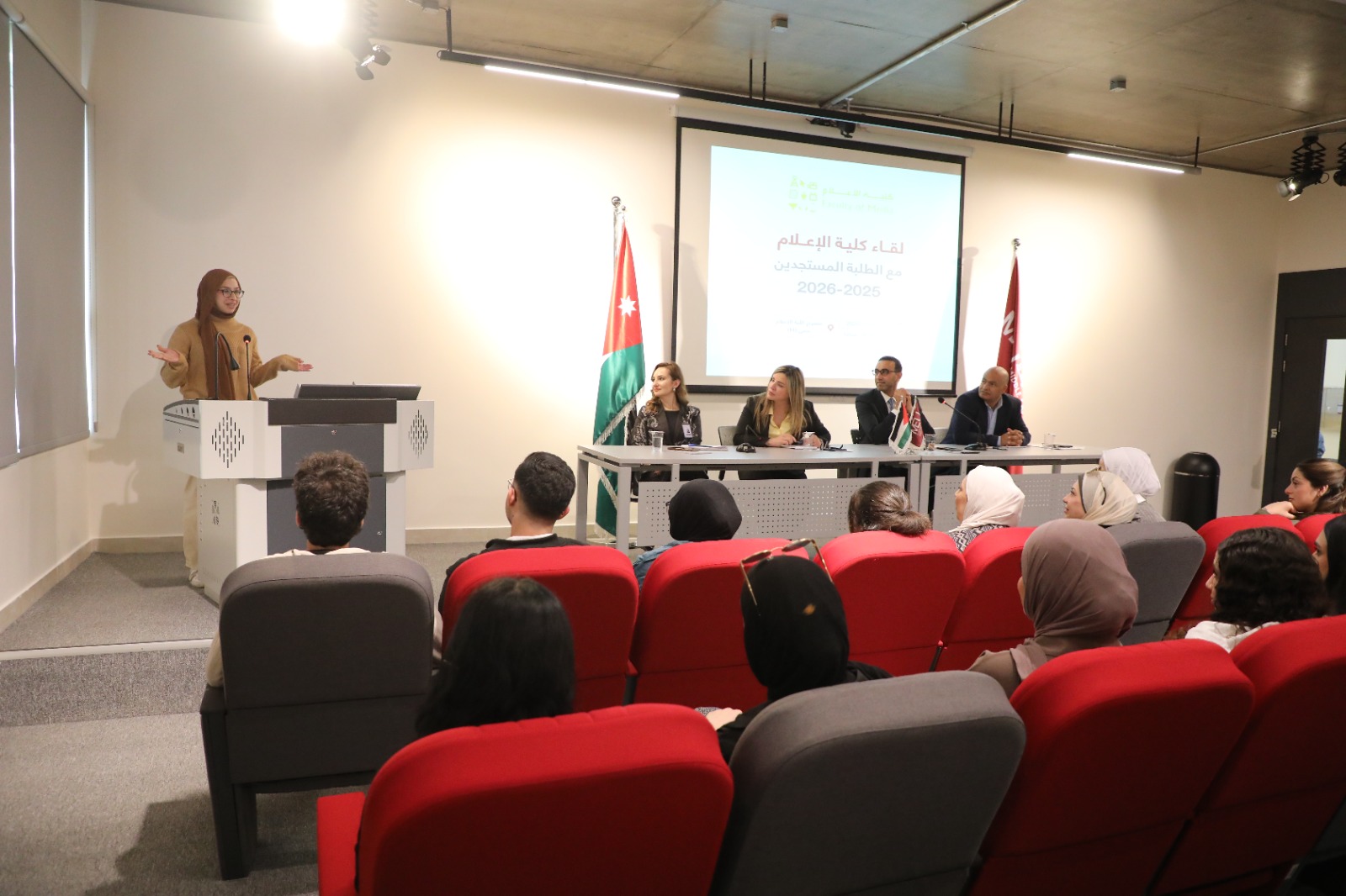 نظّمت كلية الإعلام في جامعة الشرق الأوسط لقاءً تعريفيًا لطلبتها المستجدين، في إطار سعيها الدائم إلى ترسيخ بيئة أكاديمية محفّزة تقوم على الإبداع والريادة، وتُعزّز اندماج الطلبة في الحياة الجامعية من خلال تعريفهم بمنظومة التعليم والتدريب التي تميّز الكلية، بما يتواءم مع التطورات المتسارعة في مجالات الإعلام والاتصال.