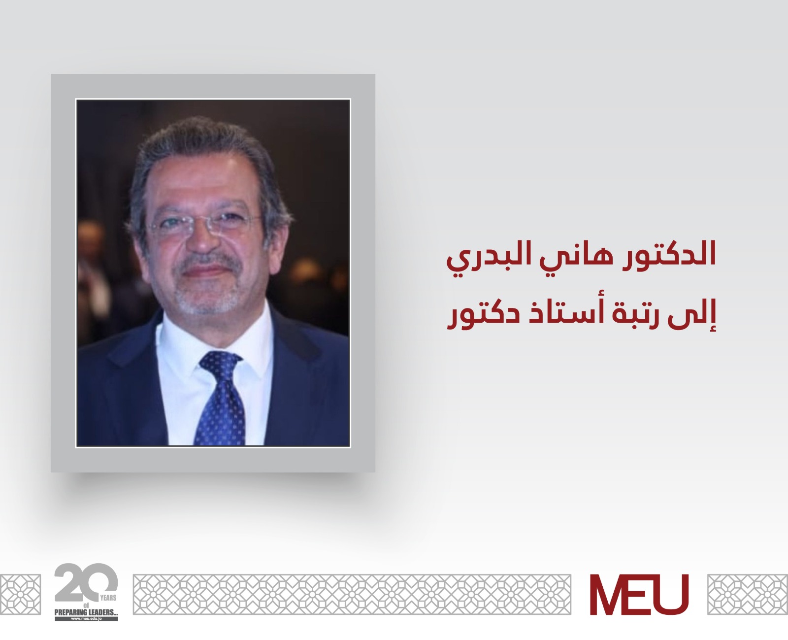 قرّر مجلس العمداء في جامعة الشرق الأوسط ترقية الدكتور هاني البدري، عضو هيئة التدريس في كلية الإعلام، إلى رتبة أستاذ في الإعلام.