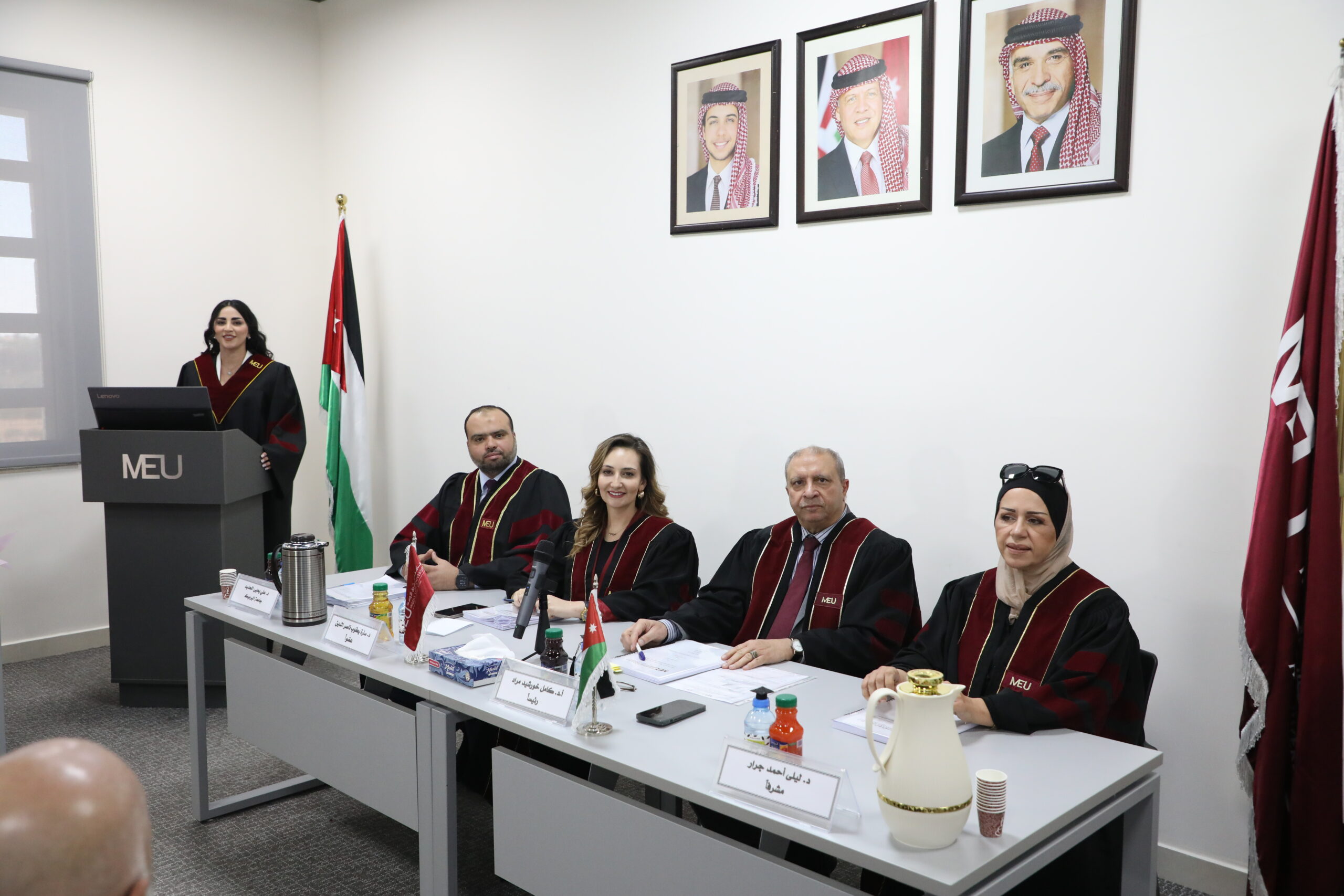 تشكلت لجنة المناقشة من الأستاذ الدكتور كامل خورشيد عضوًا ورئيسًا، والدكتورة ليلى جرار مشرفًا، والدكتورة سارة ناصر الدين عضوًا، والدكتور علي يحيى الحديد عضوًا من خارج الجامعة (جامعة اليرموك).