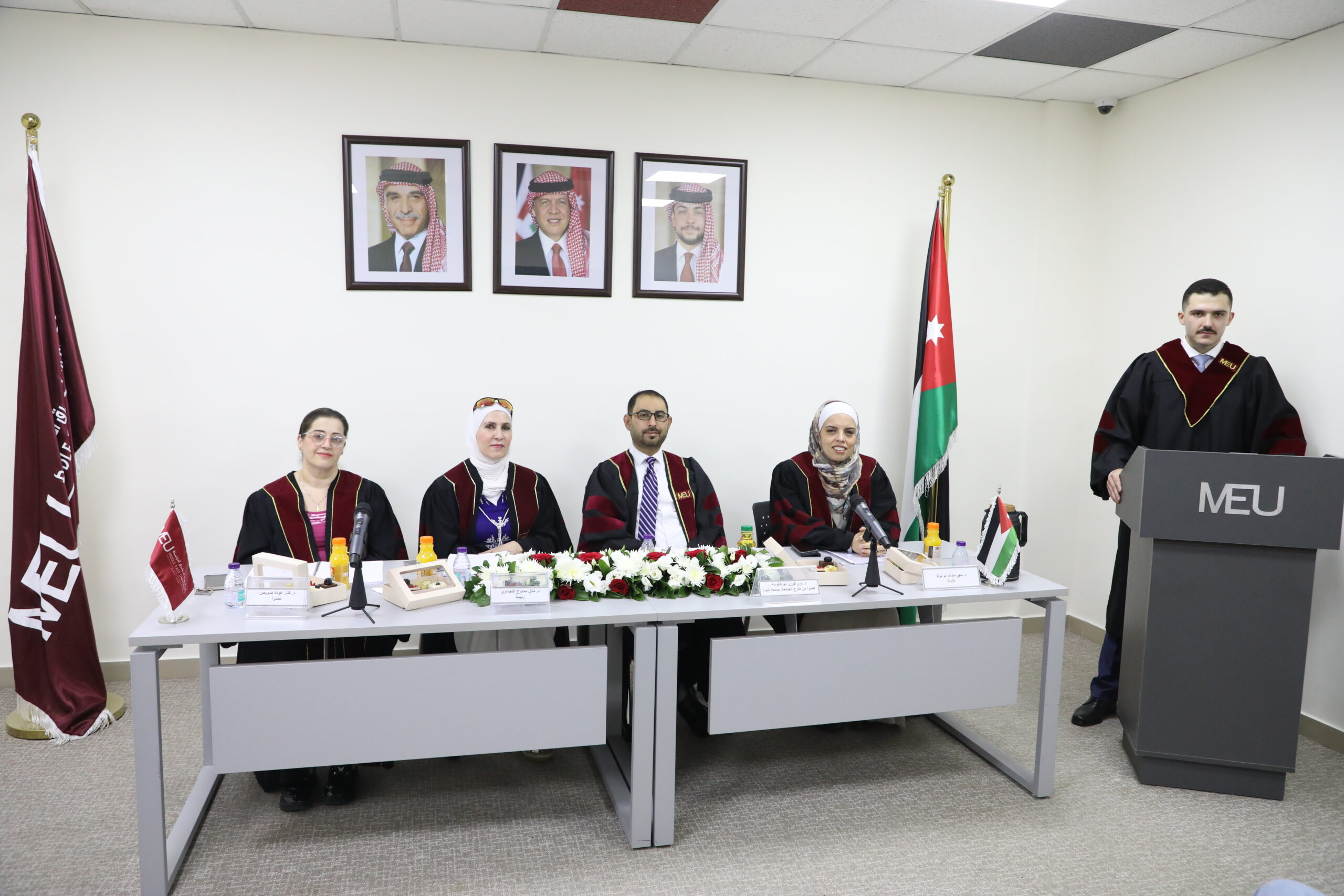 تشكلت لجنة المناقشة من الدكتورة منال النجداوي عضوًا ورئيسًا، والدكتورة سهى أبو دولة مشرفًا، والدكتورة كنار صويص عضوًا، والدكتور لؤي فوزي أبو قطوسه عضوًا من خارج الجامعة (جامعة البترا).