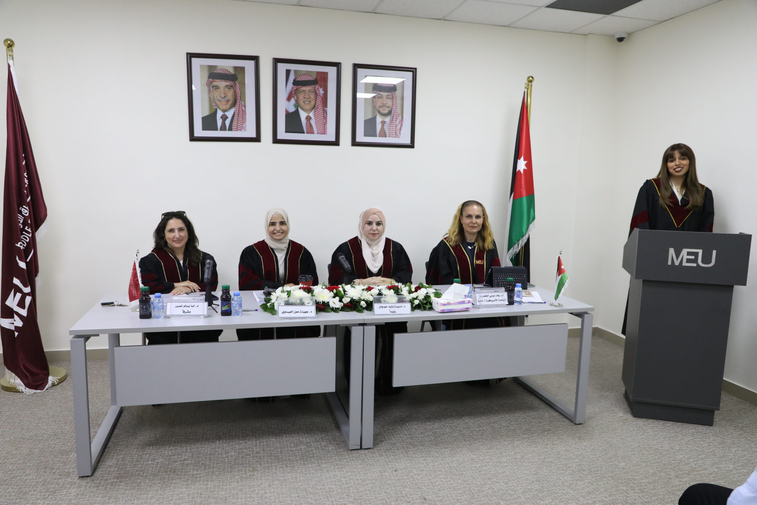 تشكلت لجنة المناقشة من الدكتورة نسيبة عوجان عضوًا ورئيسًا، والدكتورة لما نصير مشرفًا، والدكتورة جهينة العيساوي عضوًا، والأستاذة الدكتورة وفاء عوني الخضراء عضوًا من خارج الجامعة (الجامعة الأمريكية/ مادبا).