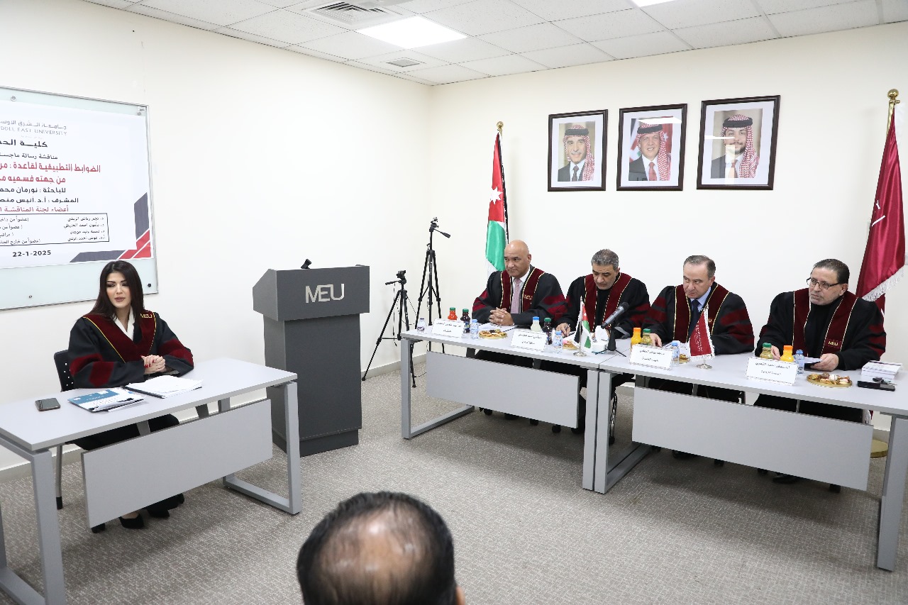 عمّان- نوقشت في كلية الحقوق بجامعة الشرق الأوسط رسالة ماجستير، بعنوان: الضوابط التطبيقية لقاعدة (من سعى في نقض ما تم من جهته فسعيه مردود عليه)، للباحثة نورمان شحاده.