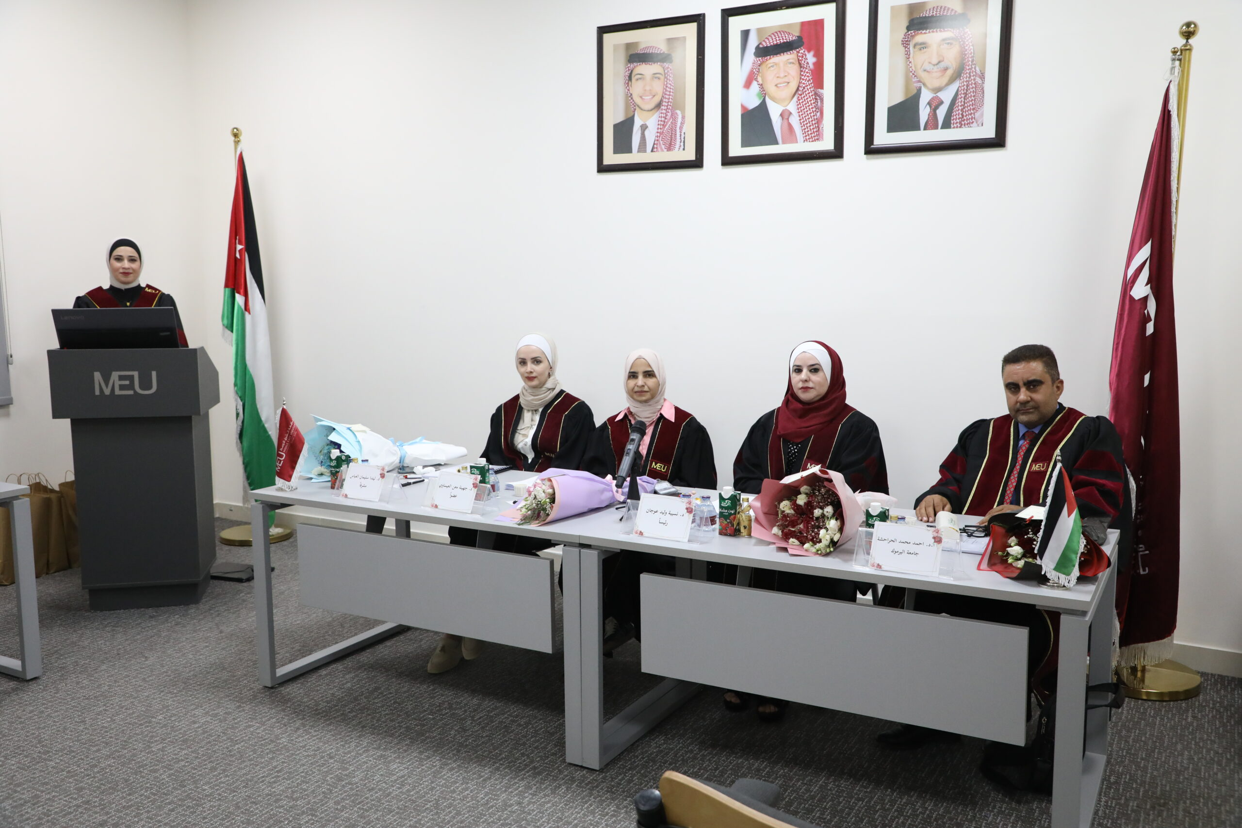تشكلت لجنة المناقشة من الدكتورة نسيبة عوجان عضوًا ورئيسًا، والدكتورة ليندا العباس مشرفًا، والدكتورة جهينة العيساوي عضوًا، والأستاذ الدكتور أحمد محمد الحراحشه عضوًا من خارج الجامعة (جامعة اليرموك).