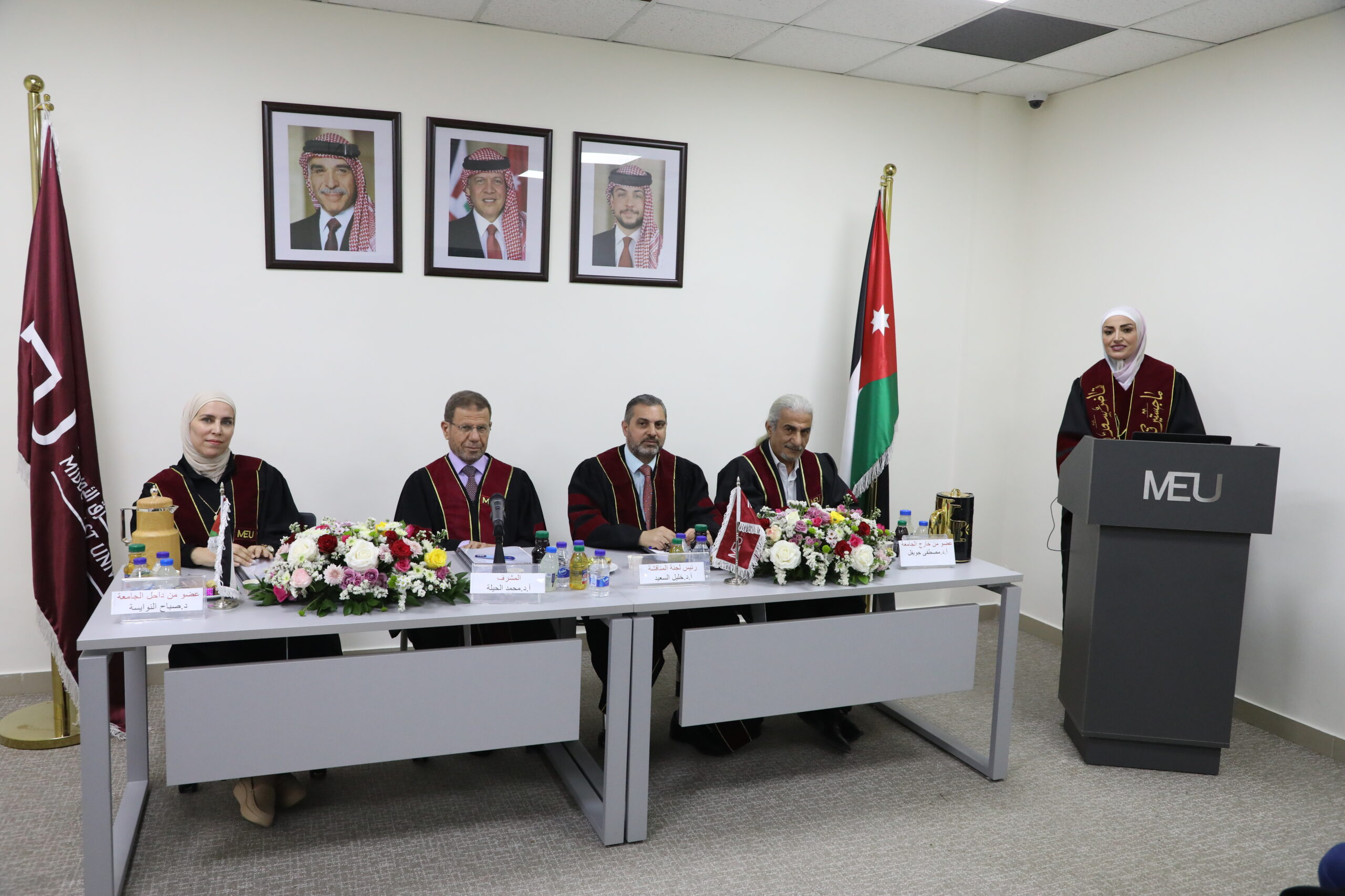 تشكلت لجنة المناقشة من الأستاذ الدكتور خليل السعيد عضوًا ورئيسًا، والأستاذ الدكتور محمد الحيلة مشرفًا، والدكتورة صباح النوايسه عضوًا، والأستاذ الدكتور مصطفى عوده جويفل عضوًا من خارج الجامعة (جامعة الحسين بن طلال).