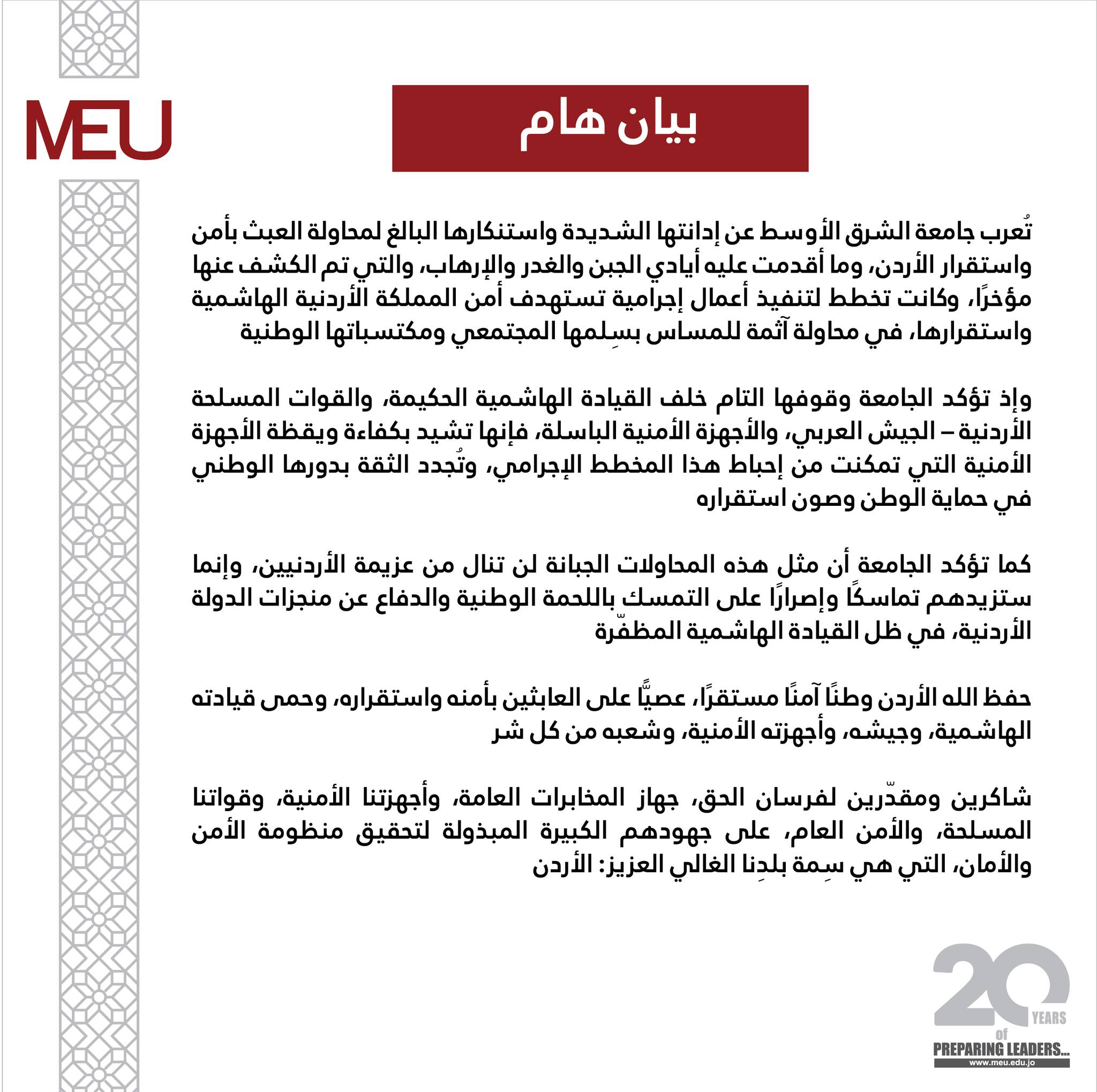 Middle East University strongly condemns the attempt to undermine the security and stability of Jordan and what was done by the hands of cowardice, treachery and terrorism, which was recently revealed, and was planning to carry out criminal acts targeting the security and stability of the Hashemite Kingdom of Jordan, in a sinful attempt to undermine its societal peace and national gains.