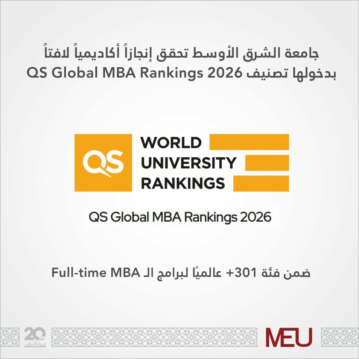 في خطوة تُعدّ علامة فارقة في مسيرتها الأكاديمية، حققت جامعة الشرق الأوسط إنجازًا دوليًا مرموقًا بدخولها تصنيف QS Global MBA Rankings 2026، وهو أحد أبرز التصنيفات العالمية المتخصصة في تقييم برامج الماجستير في إدارة الأعمال (MBA). وقد جاءت الجامعة ضمن فئة +301 على مستوى العالم لبرامج الـ Full-time MBA، مما يضعها بين نخبة من مؤسسات