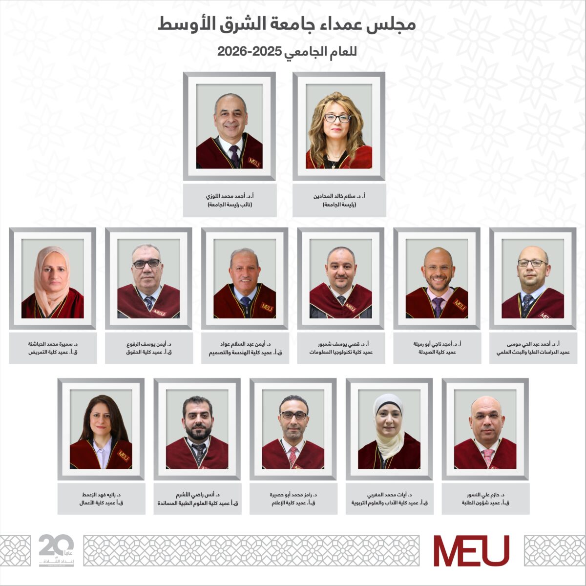 استمرارًا لمسيرتها الريادية في التعليم العالي والبحث العلمي، قرر مجلس أمناء جامعة الشرق الأوسط، برئاسة سعادة الدكتور يعقوب ناصر الدين، بناءً على تنسيب عطوفة الأستاذة الدكتورة سلام المحادين رئيسة الجامعة، الموافقة على تشكيل مجلس العمداء، وذلك وفق رؤية الجامعة الاستراتيجية. وجاء تشكيل مجلس العمداء للعام الجامعي (2026/2025) على النحو الآتي: • الأستاذ الدكتور أحمد اللوزي