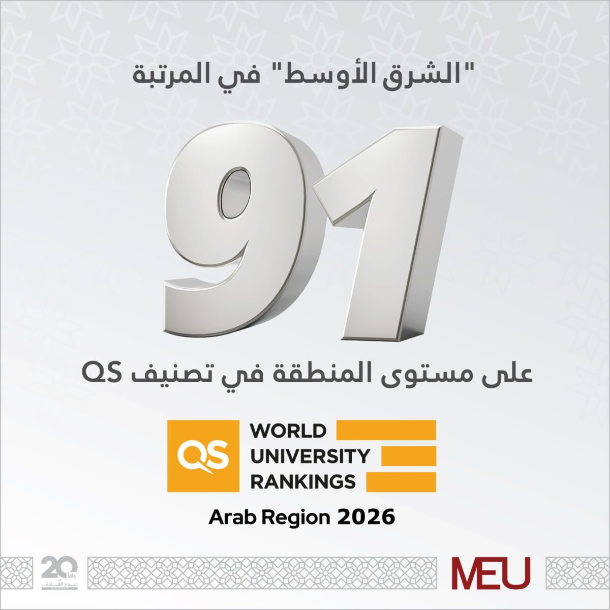 Middle East University has been ranked 91st regionally in the 2026 QS Ranking, signifying an advancement in the domains of internationalisation, scientific research and academic productivity. The university demonstrated distinguished performance in a number of key indicators, including its international research network collaboration, the proportion of international students, research outcome per faculty member, and citations
