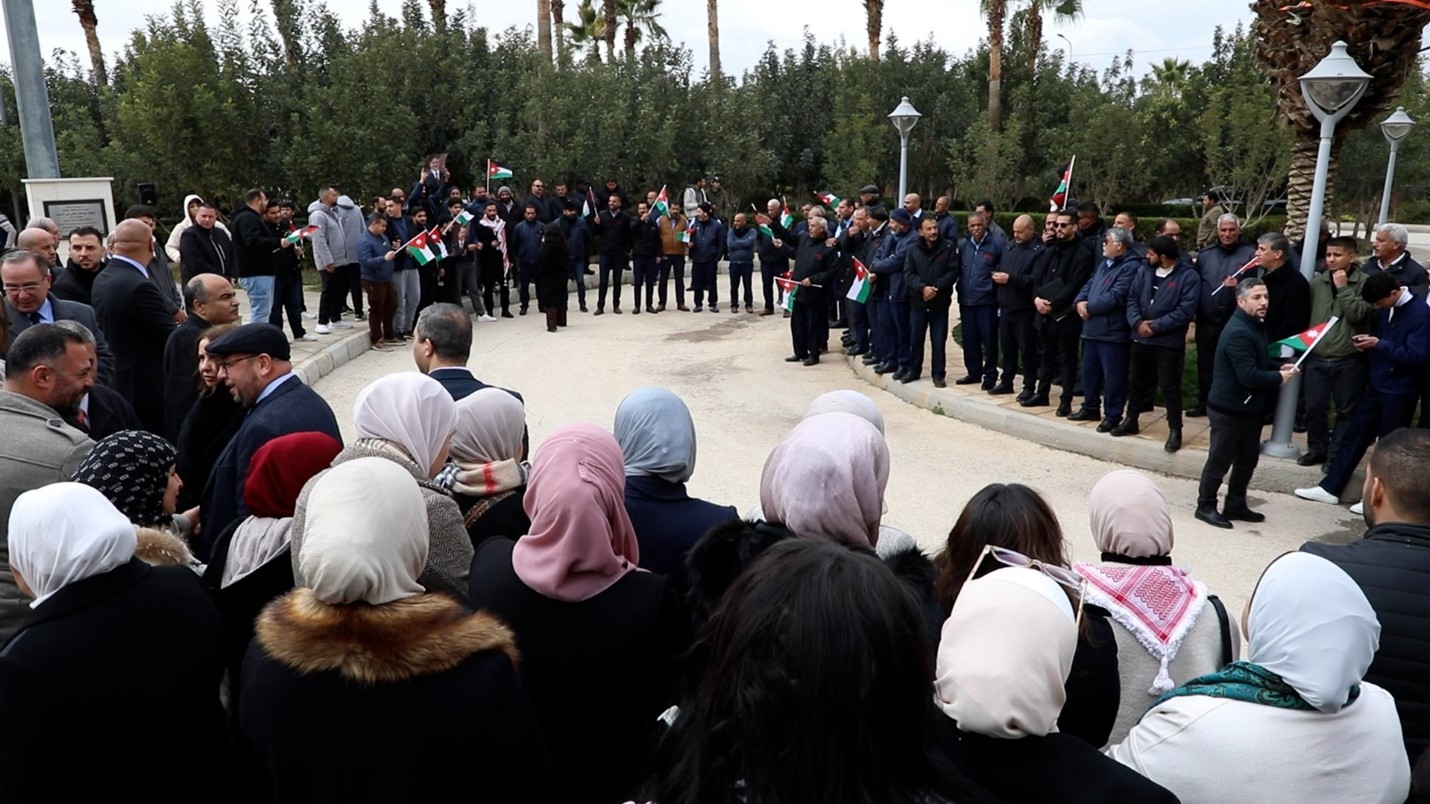 Middle East University organised a solidarity rally to express its categorical rejection of attempts to displace the Palestinian people from the Gaza Strip and to affirm its firm stand behind His Majesty King Abdullah II Bin Al-Hussein and the wise Hashemite leadership in defending the Palestinian cause and protecting the legitimate historical rights of the Palestinian people.