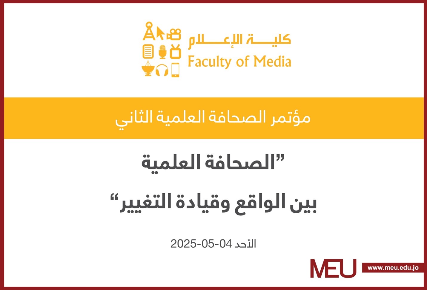 The Faculty of Media at Middle East University is organising its second scientific conference entitled “Scientific Journalism between Reality and Leading Change,” which coincides with the celebration of World Press Freedom Day, which falls on May 3, 2025.
