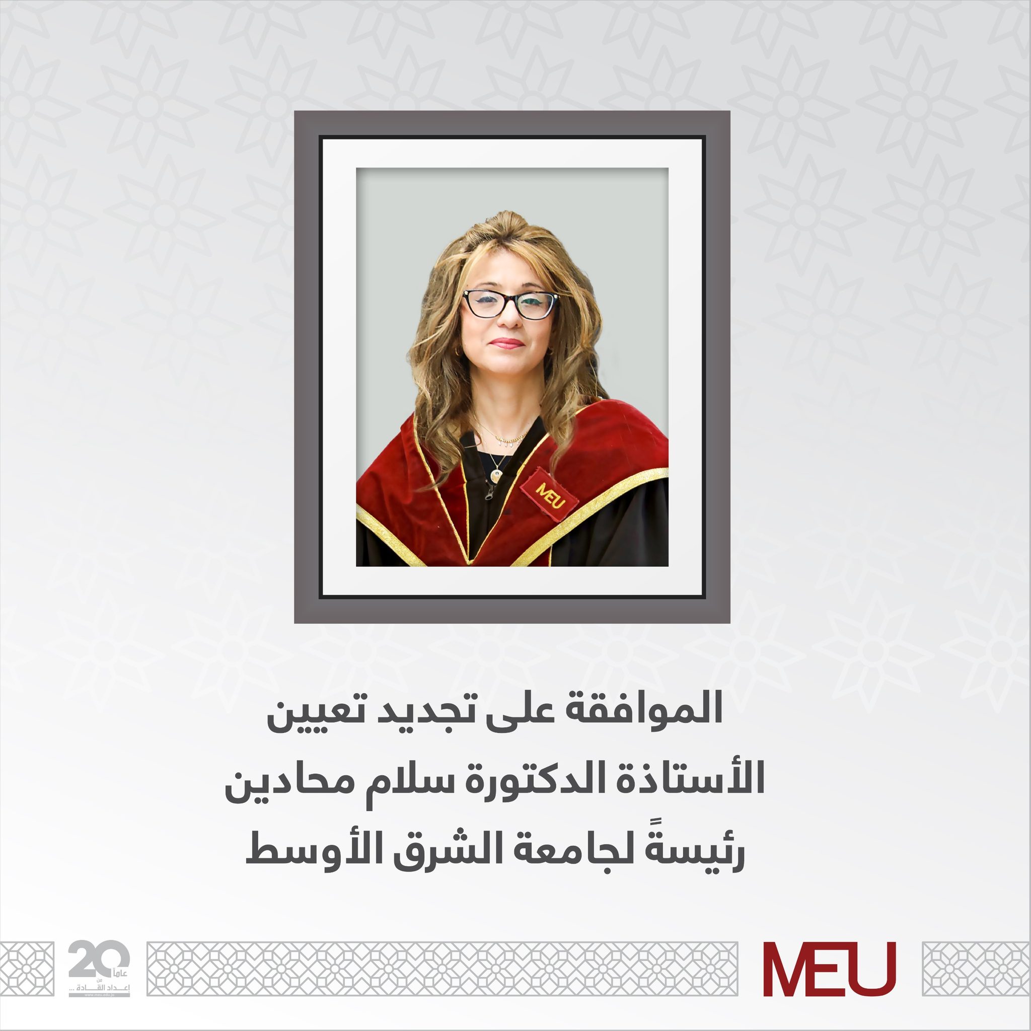 The Board of Trustees of Middle East University has renewed its confidence in Professor Salam Khalid Al-Mahadeen by extending her term of appointment as University President for a further four-year period.
